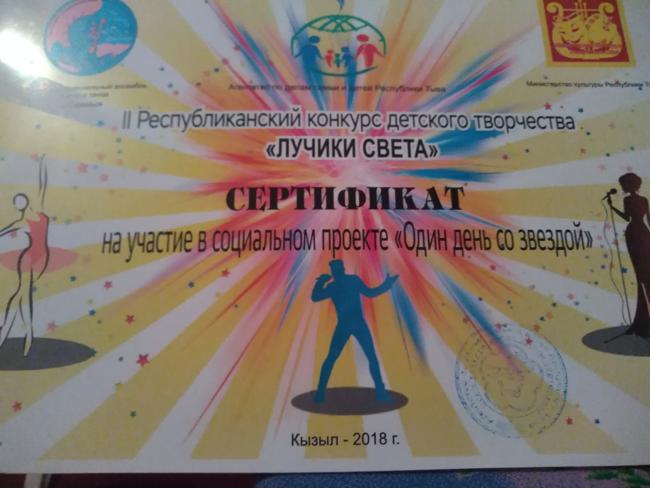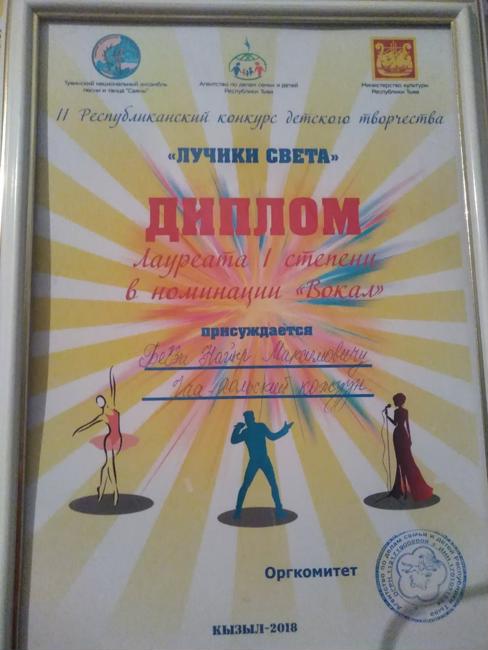 Ученик 4"б" класса МБОУ СОШ им.Ш.Ч.Сат Чаа-Холь Найыр Бегзи стал лауреатом I степени по вокалу II Республиканского конкурса детского творчества "Лучики света" организованного Агентством семьи и детей Республики Тыва и Тувинским национальным ансамблем песни и танца "Саяны".